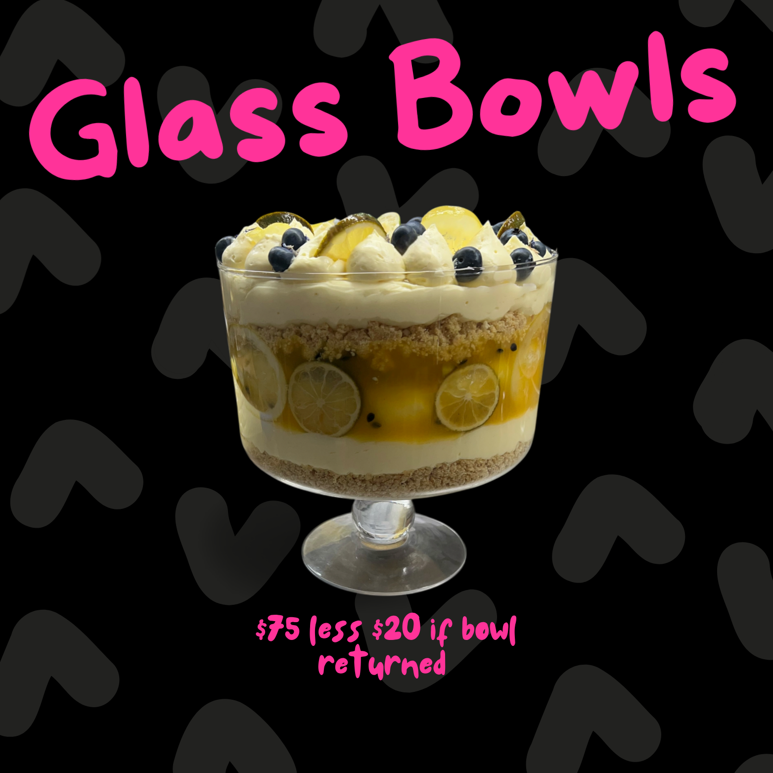 We can make all our dessert bowls in a footed glass bowls for when you want something a bit fancy. For $75 you get a bigger dessert than our standard bowls and if you return the bowl undamaged will give you a $20 refund.